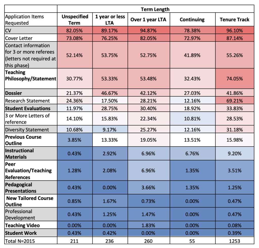 The heat map below shows the frequency with which various documents were requested of first round applicants, depending on the term length (e.g., limited term appointment or continuing). Elements related to teaching effectiveness are bolded. Note that this table is not an exhaustive catalogue of all application requirements, as the focus of this inquiry was painting a broad picture of the application process, with an additional zoom-in on evidence of teaching effectiveness to demonstrate what, if any, teaching experience institutions expect of their applicants.