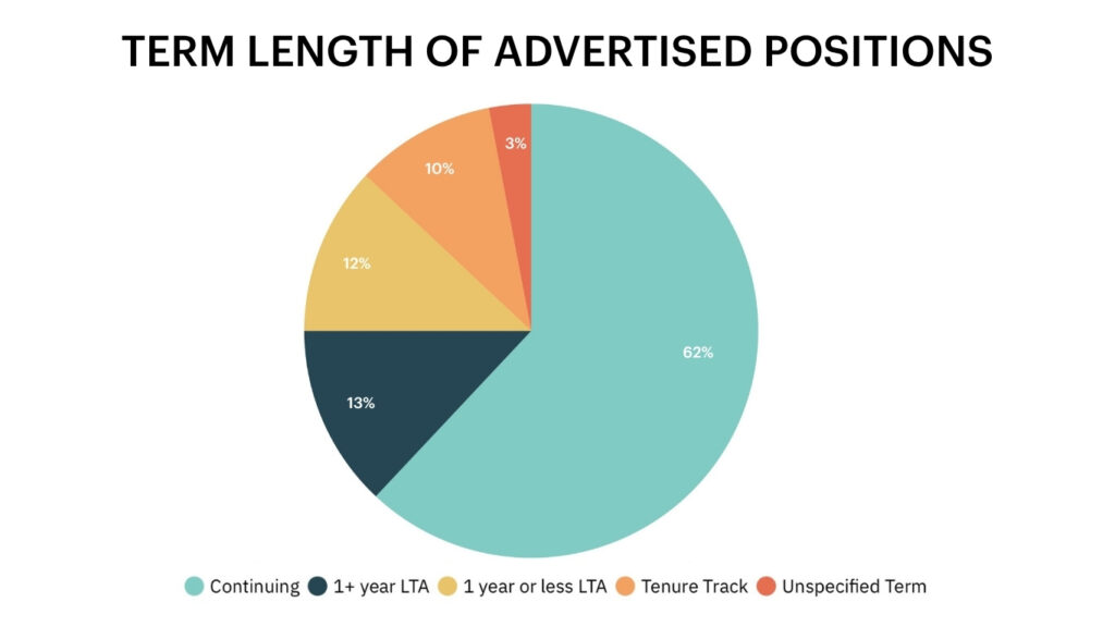 We catalogued 2022 job postings on University Affairs that were open to recent graduates with terminal degrees (i.e., the highest attainable degree in a given field, often a PhD but sometimes an MFA or other masters level degree), creating a data set of 2104 job ads. After removing ads that did not specify what materials were needed to apply, we were left with a final catalogue of 2015 job ads, reflecting 370 jobs in humanities departments, 766 in social sciences departments, and 879 in STEM departments. Of note is the number of limited-term appointments (LTAs) reflected in this catalogue. The chart below illustrates the term-length of the positions advertised, with limited-term appointments accounting for 25 per cent, tenure-track and continuing for 65 per cent, and positions with unspecified term length accounting for the remaining 10 per cent.